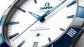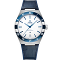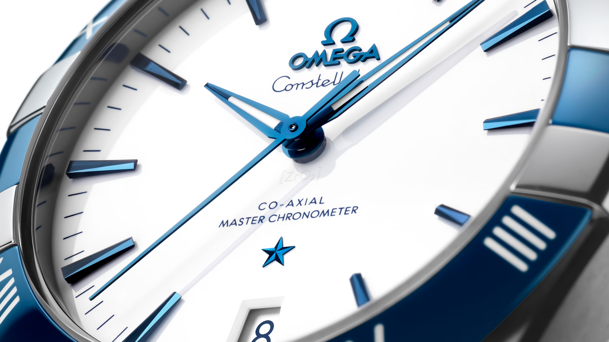 This 41 mm stainless steel model features a polished blue ceramic bezel with Roman numerals in “Grand Feu” white enamel, a white ceramic dial and a date window at the 6 o'clock position. The hands, OMEGA logo, Constellation star and facetted indexes are all blued.