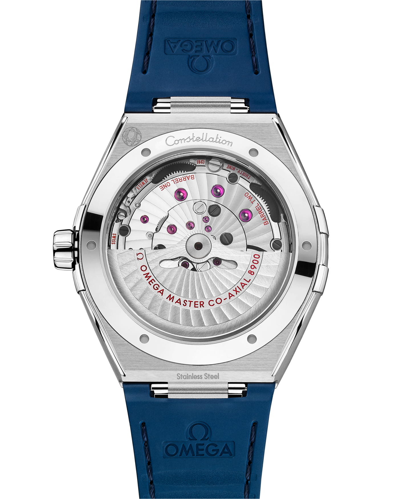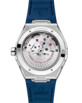 Presented on a blue leather strap with rubber lining, this timepiece is driven by the OMEGA Co-Axial Master Chronometer Calibre 8900, visible through the domed scratch-resistant sapphire crystal.