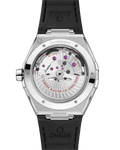 This 41 mm stainless steel model features a polished black ceramic bezel with Roman numerals in Liquidmetal™, a silk-embossed rhodium-grey dial and a date window at the 6 o'clock position. The hands, OMEGA logo, Constellation star and facetted indexes are all blackened.