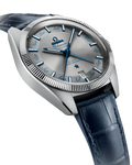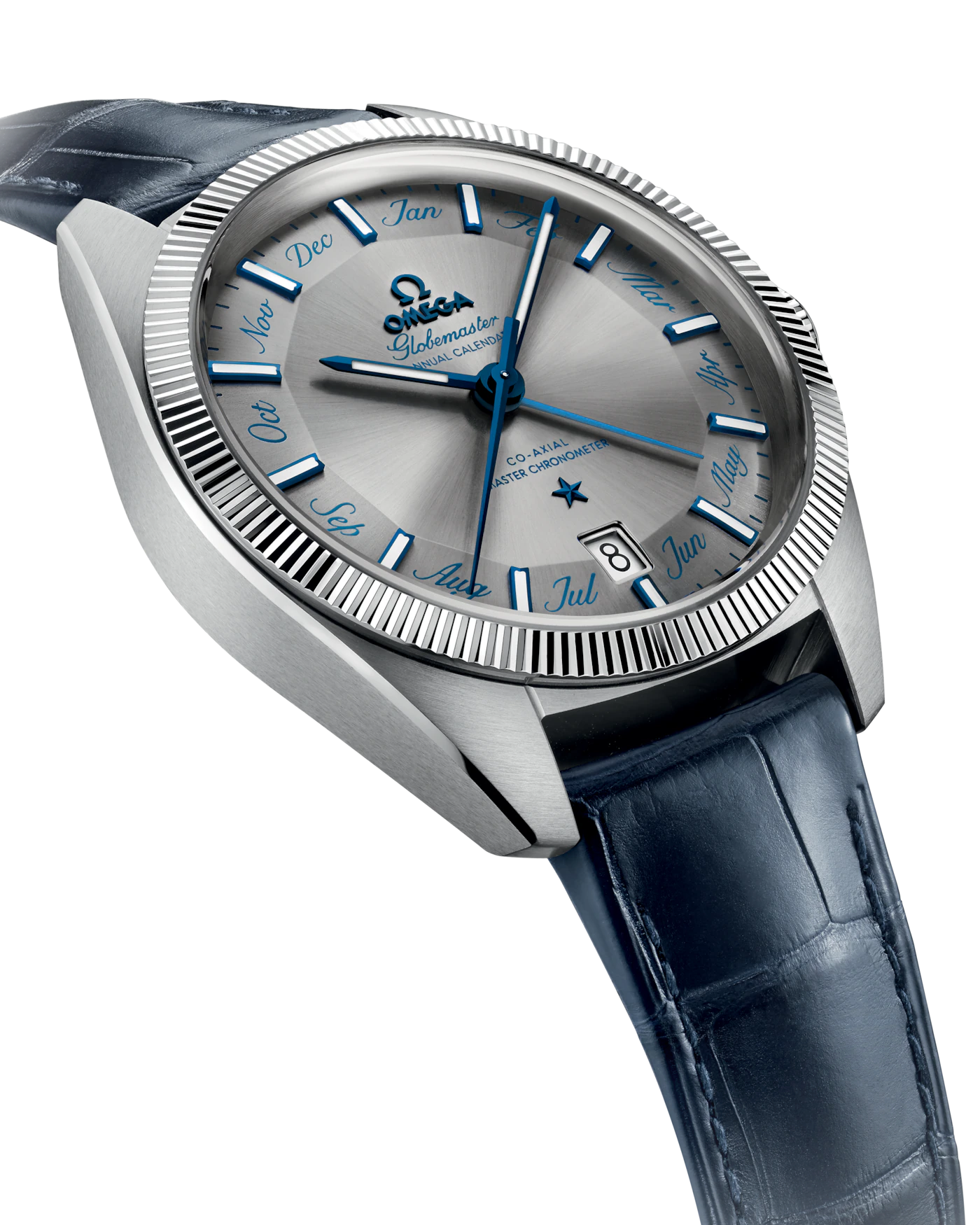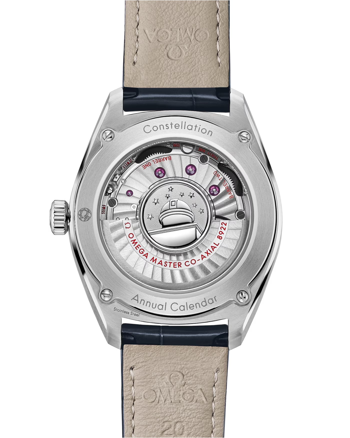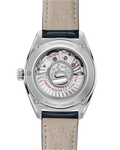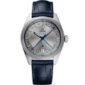 This watch has a blue leather strap and is driven by OMEGA's Co-Axial Master Chronometer Annual Calendar Calibre 8922, featuring revolutionary anti-magnetic technology.