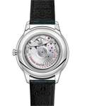 The pure look of the timepiece is completed by a date window at 3 o’clock, a small-seconds subdial at 6 o’clock, and a railway minute track on the outer zone.