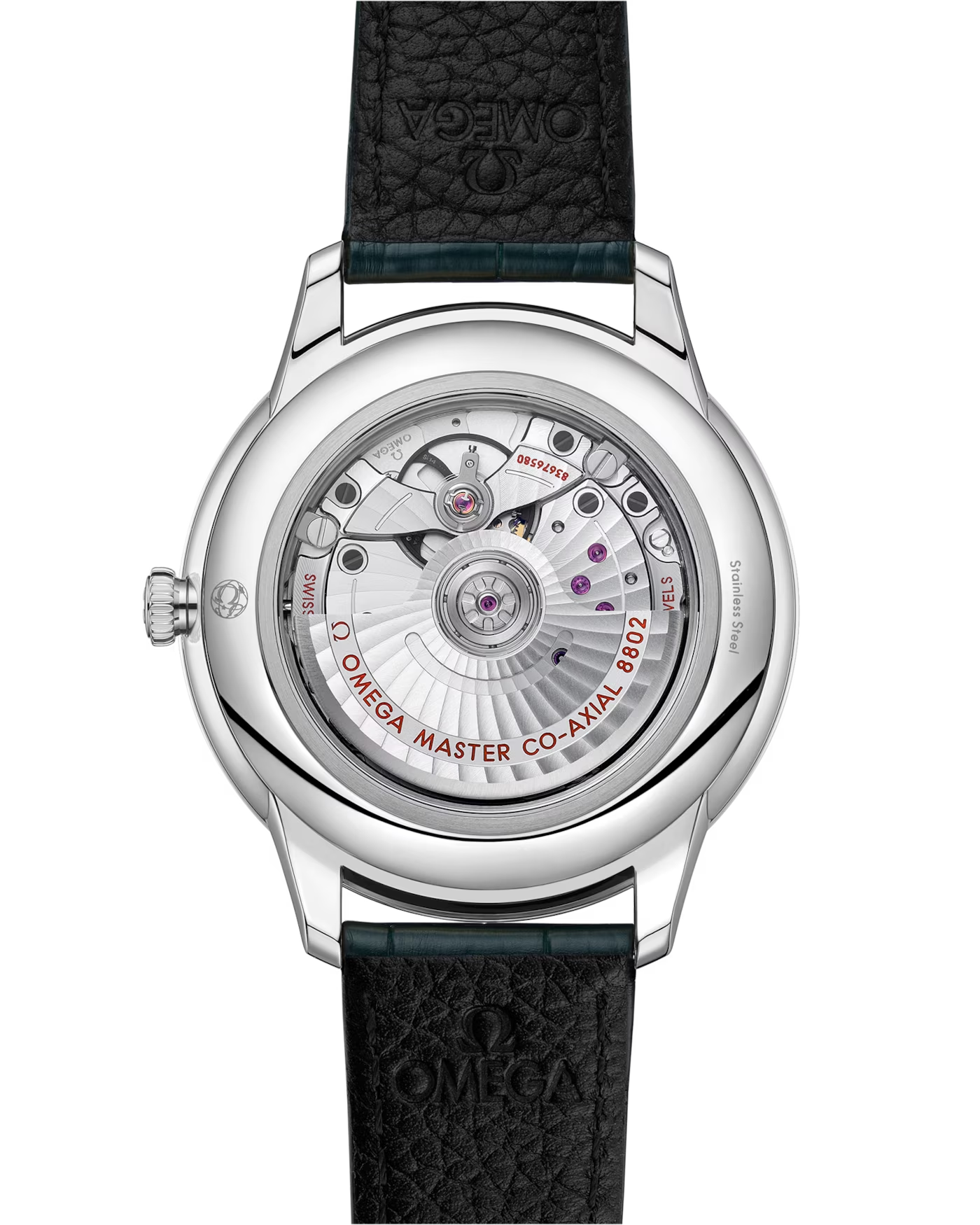 This Master Chronometer certified watch is presented on a pine green leather strap and is driven by the OMEGA Master Co-Axial Calibre 8802, which can be admired through the scratch-resistant sapphire crystal caseback.