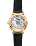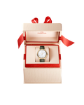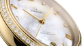 In this 34 mm 18K yellow gold model with its diamond-paved bezel, the dial is crafted from white mother-of-pearl. The display is distinguished by yellow gold-plated hands, as well as alternating Roman numerals and diamond markers.