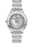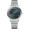 In this 40 mm stainless steel model, the domed PVD pine green dial features a sun-brushed finish. The display is distinguished by rhodium-plated hands, as well as alternating Roman numerals and cabochon indexes.