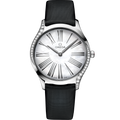 The slim 36 mm case is made from stainless steel and features diamond paving that curves along each side, as well as a crown that is polished with red 'HyCeram' and set with a single diamond. The mother-of-pearl dial includes unique transferred Roman numerals and elegant blackened hands.
