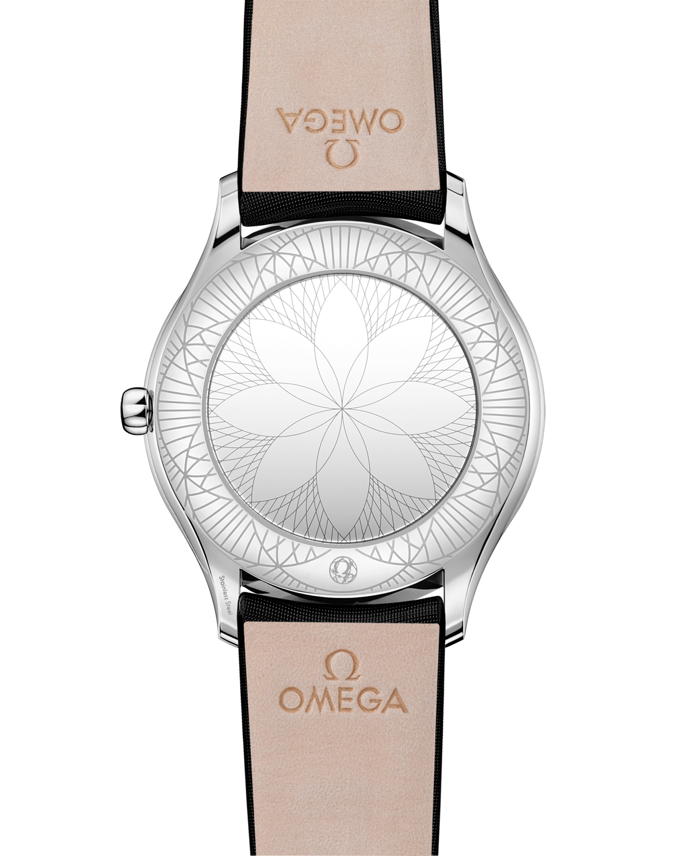 The watch is driven by the OMEGA caliber 4061, which sits behind a special mirrored case back with a “Her Time” pattern. Finally, the watch is presented on a black fabric strap.