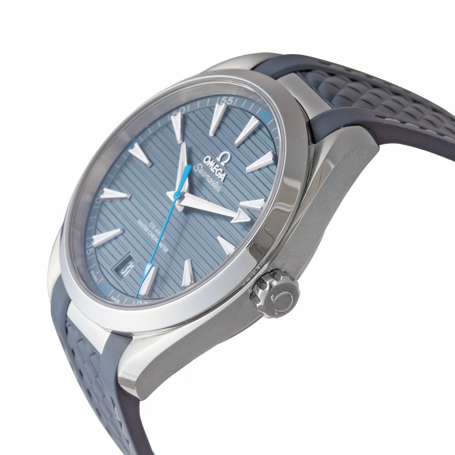 Omega Seamaster Aqua Terra 150M wristwatch (ref. 220.12.41.21.03.002), featuring a self-winding caliber 8900 co-axial movement; blue lined dial; date display at 6 o'clock; sapphire crystal, exhibition case back; and 41mm, stainless steel case on a blue rubber strap with white cross-stitching secured by the Omega steel foldover clasp.
