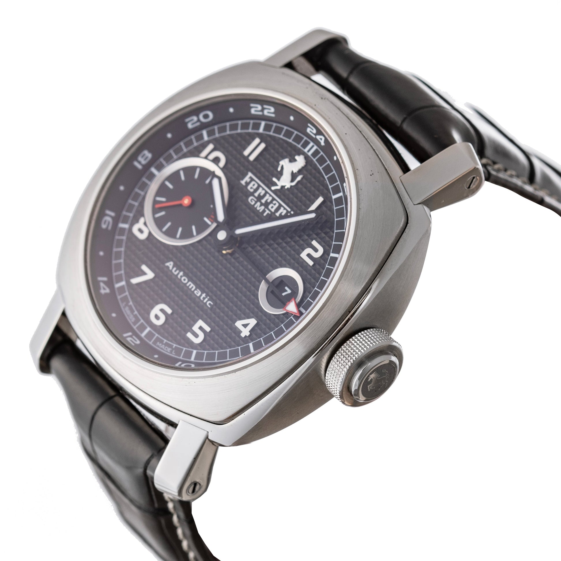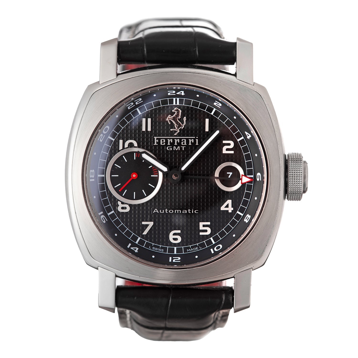 Panerai Ferrari Granturismo GMT 45mm (FER00003), featuring a self-winding automatic movement; black square-grid textured dial with Ferrari logo & prancing horse at 12 o'clock; date display at 3 o'clock; small seconds subdial at 9 o'clock; dual time zone indicated with central arrow-shaped hand; and 45mm, stainless steel case on a black crocodile strap with white stitching & red backing secured by a Ferrari branded steel fold-over clasp.