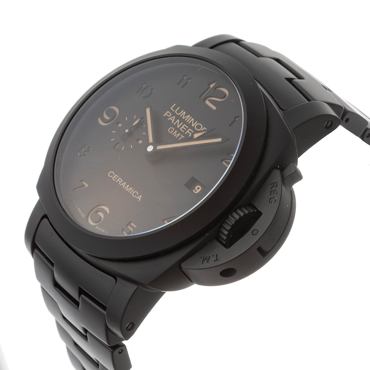 Panerai Luminor GMT 'Tuttonero' wristwatch (ref. PAM00438), featuring the P.9001/B Caliber self-winding automatic movement with a 3-day power reserve when fully wound; matte black dial; date aperture at 3 o'clock; small seconds subdial at 9 o'clock; dual time zone function by center GMT hand; and 44mm, black ceramic case on a black ceramic link bracelet.