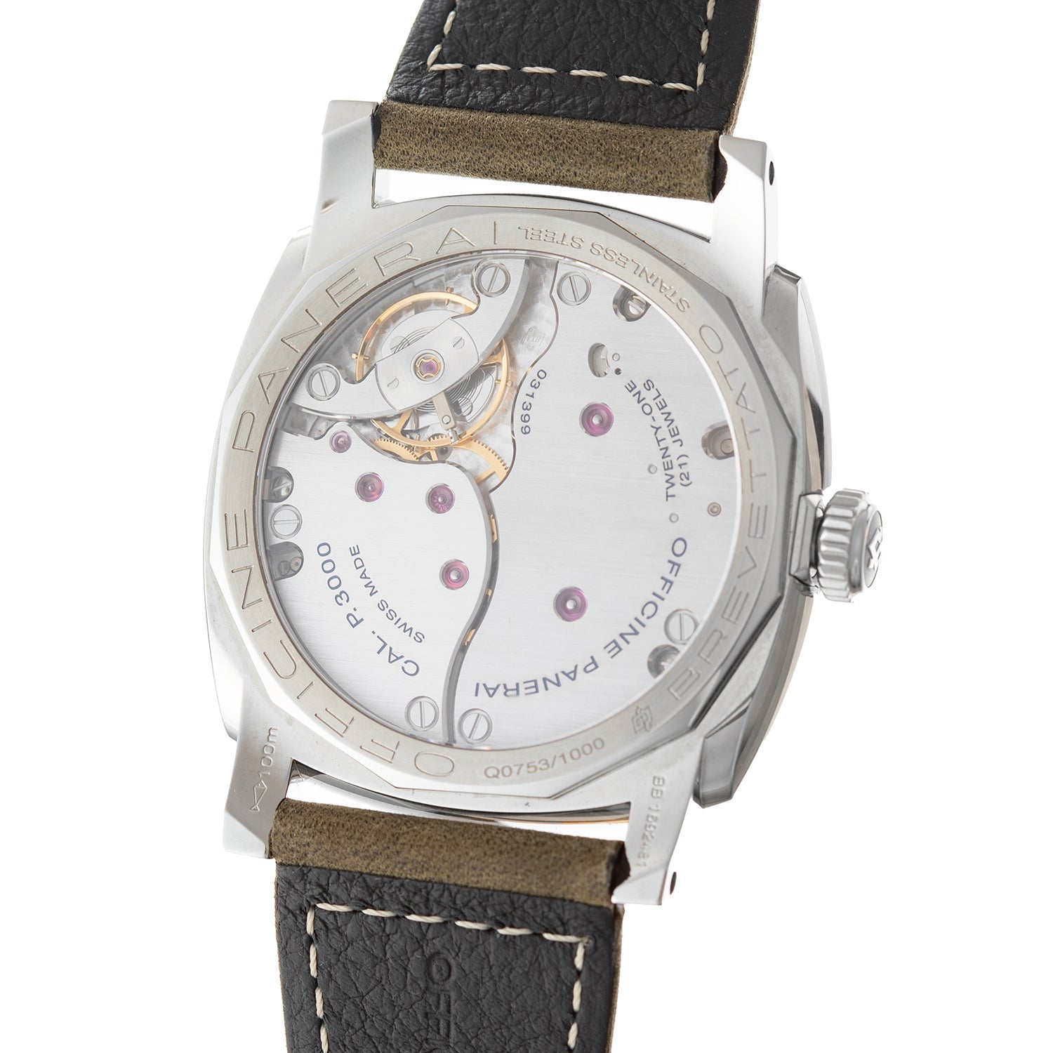 Panerai Radiomir 'Marina Militare' wristwatch (ref. PAM00587), featuring the P.3000 caliber hand-wound movement with an approximate three-day power reserve when fully wound; black 'sandwich' dial with luminous Arabic numerals & hour markers; transparent, exhibition case back; and 47mm, stainless steel case on an olive-colored calfskin leather strap secured by the Panerai steel ardillon buckle.