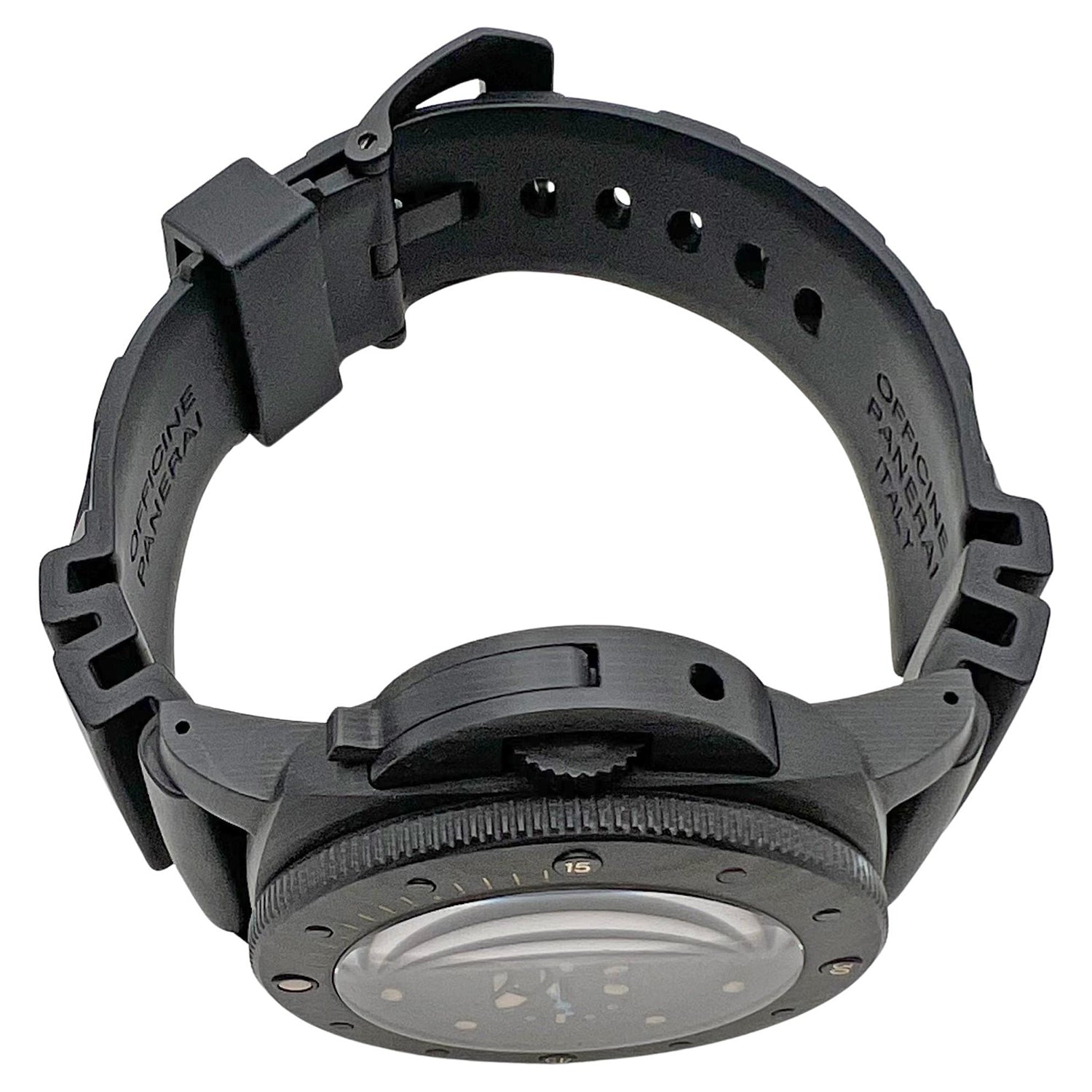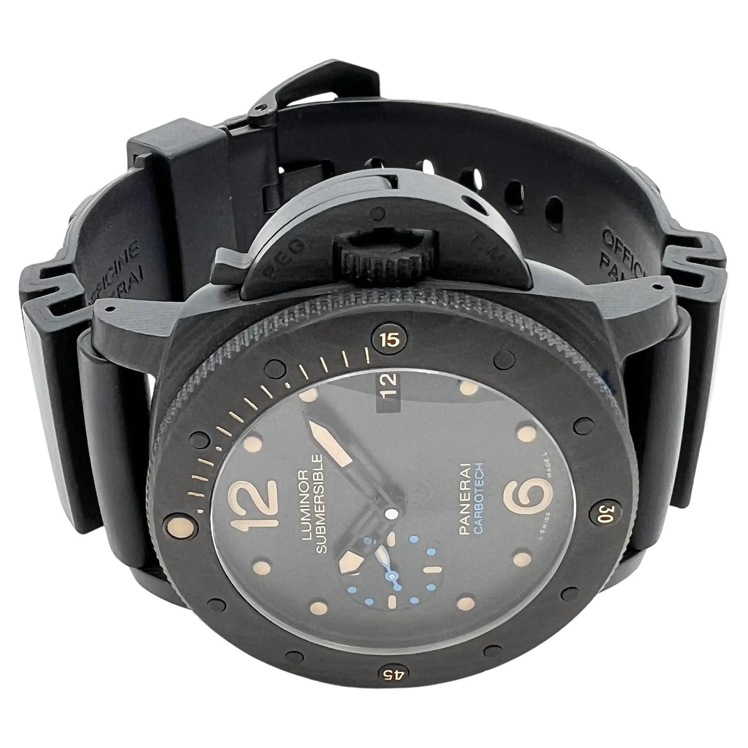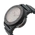 Panerai Submersible Carbotech (ref. PAM00616), featuring the P.9000 caliber self-winding automatic movement with an approximate 3-day power reserve when fully wound; black dial with luminous hands & hour markers; date display at 3 o'clock; small seconds subdial at 9 o'clock; and 47mm, Carbotech case on a black rubber strap secured by the matching Panerai buckle.