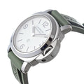 Panerai Luminor Base wristwatch (ref. PAM01087), featuring the P.6000 caliber manual-winding movement with a 3-day power reserve when fully wound; white dial with luminous Arabic numeral & hour markers; and 44mm, stainless steel case on a military green rubber strap secured by the Panerai steel buckle.