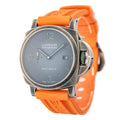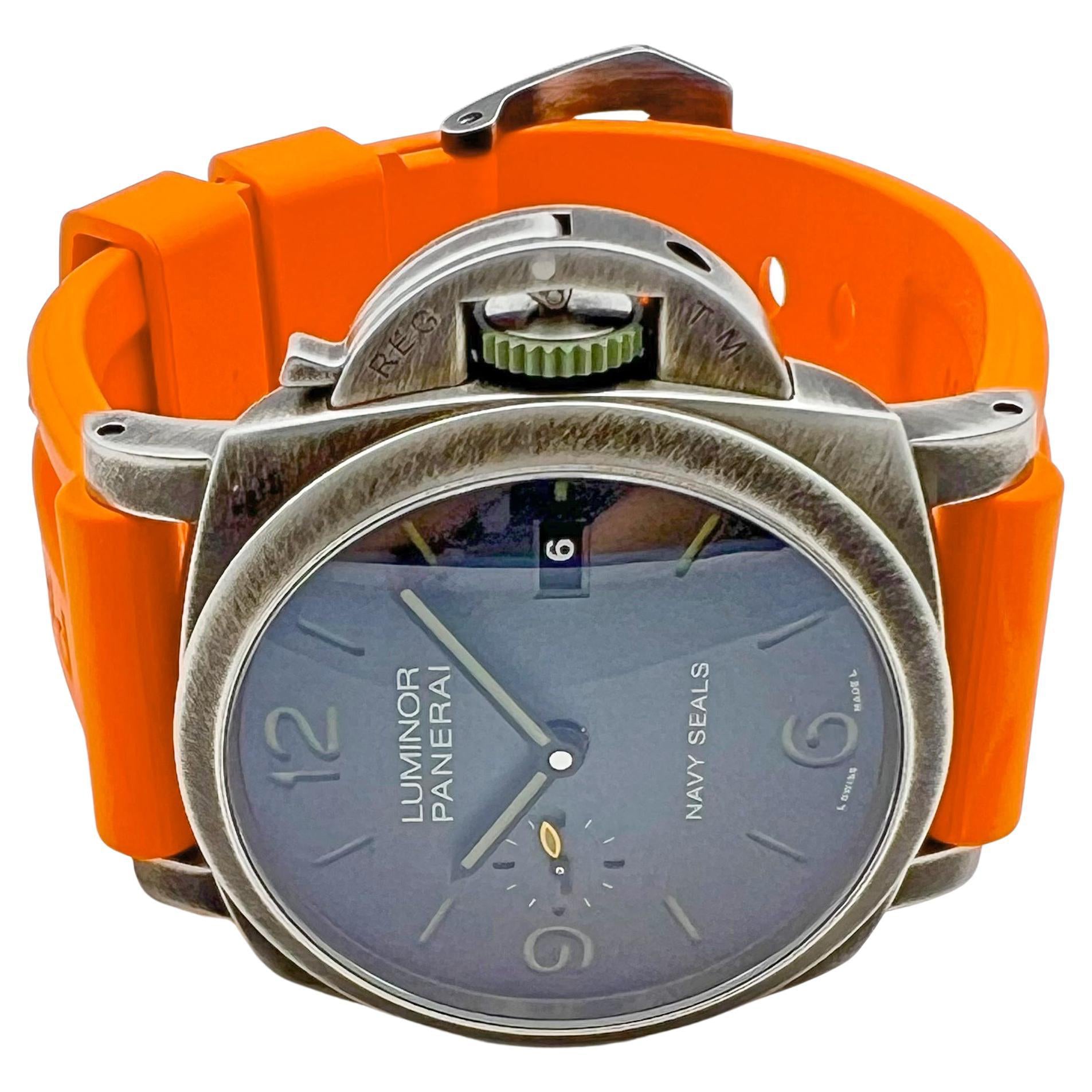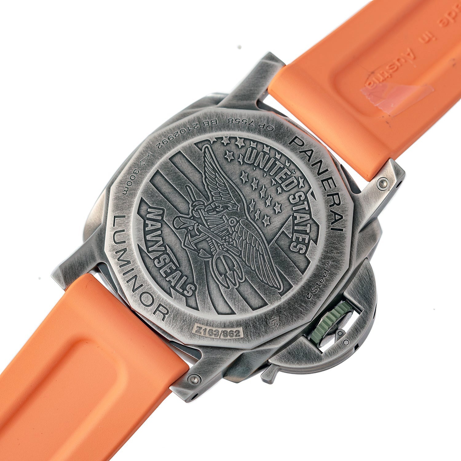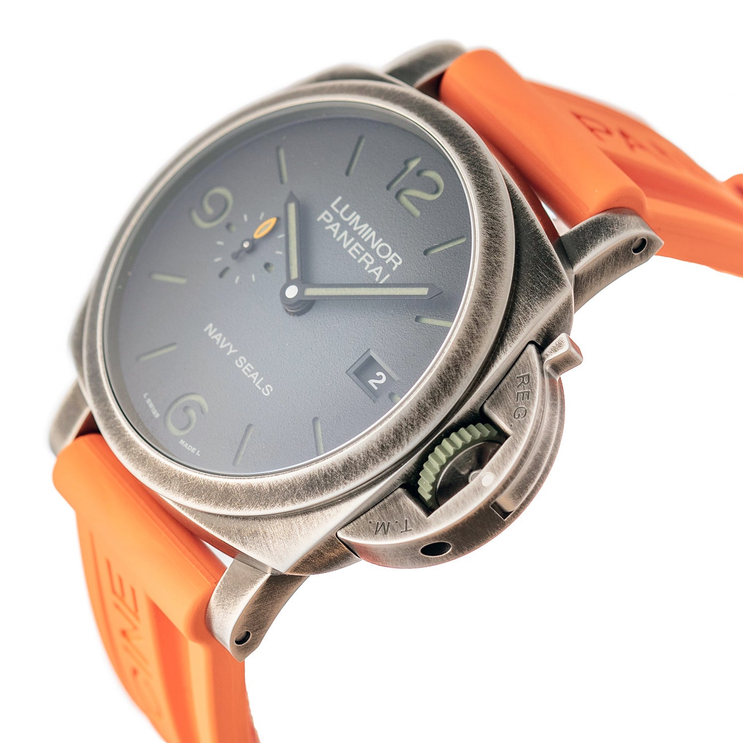 Panerai Luminor Marina Navy SEALs (ref. PAM01412), featuring the P.9010 caliber mechanical automatic movement with a 3-day power reserve when fully wound; anthracite gray dial; date aperture at 3 o'clock; small seconds subdial at 9 o'clock; and 44mm, brunito-finished stainless steel case on an orange rubber strap secured by the Panerai steel buckle.