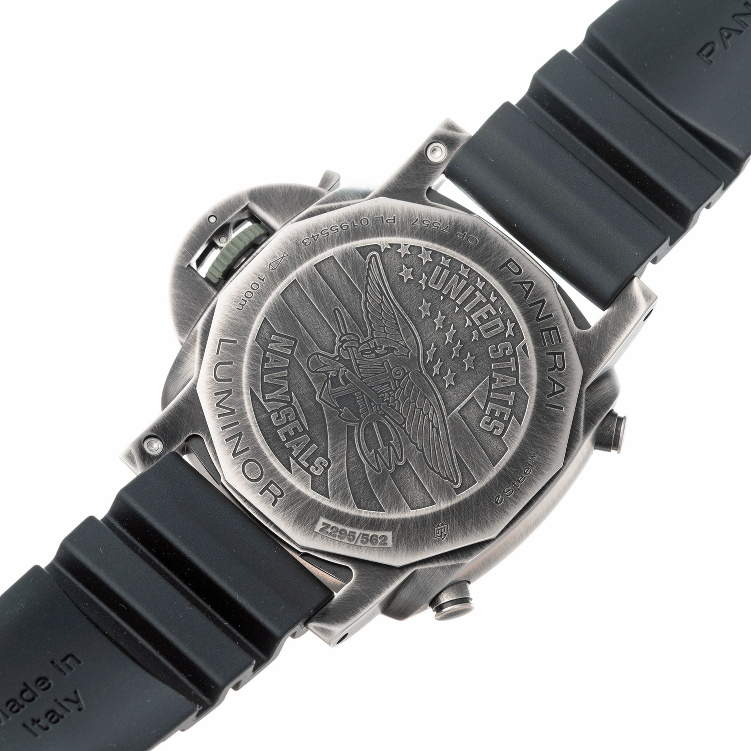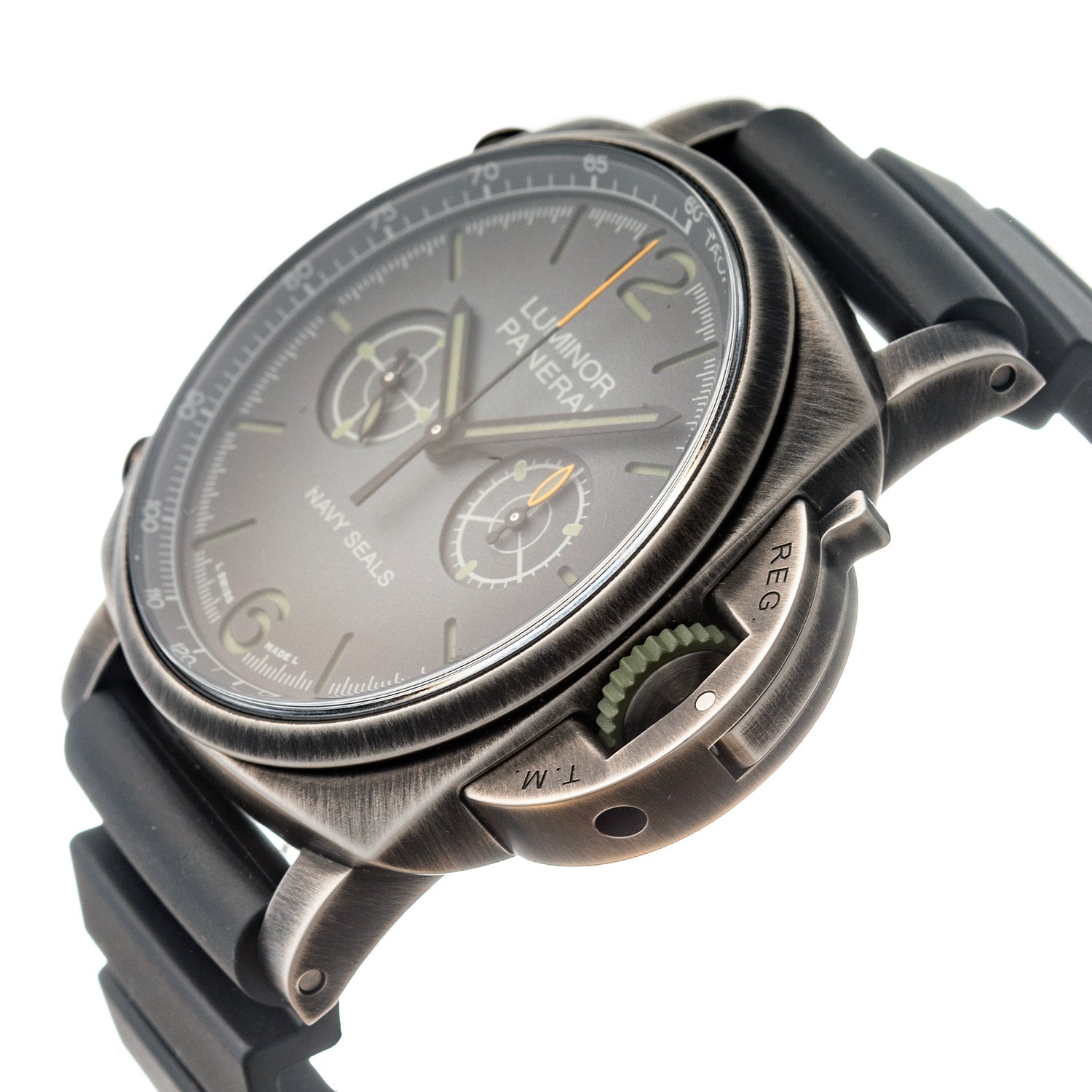 Panerai Submersible Chrono Navy SEALs (ref. PAM01409), featuring the P.9200 calibre automatic movement with a 42-hour power reserve when fully wound; gray-shaded dial; 30-minute chrono register at 3 o'clock; small seconds subdial at 9 o'clock; and 44mm, brunito-finished stainless steel case on a black rubber strap secured by the Panerai steel buckle.