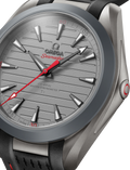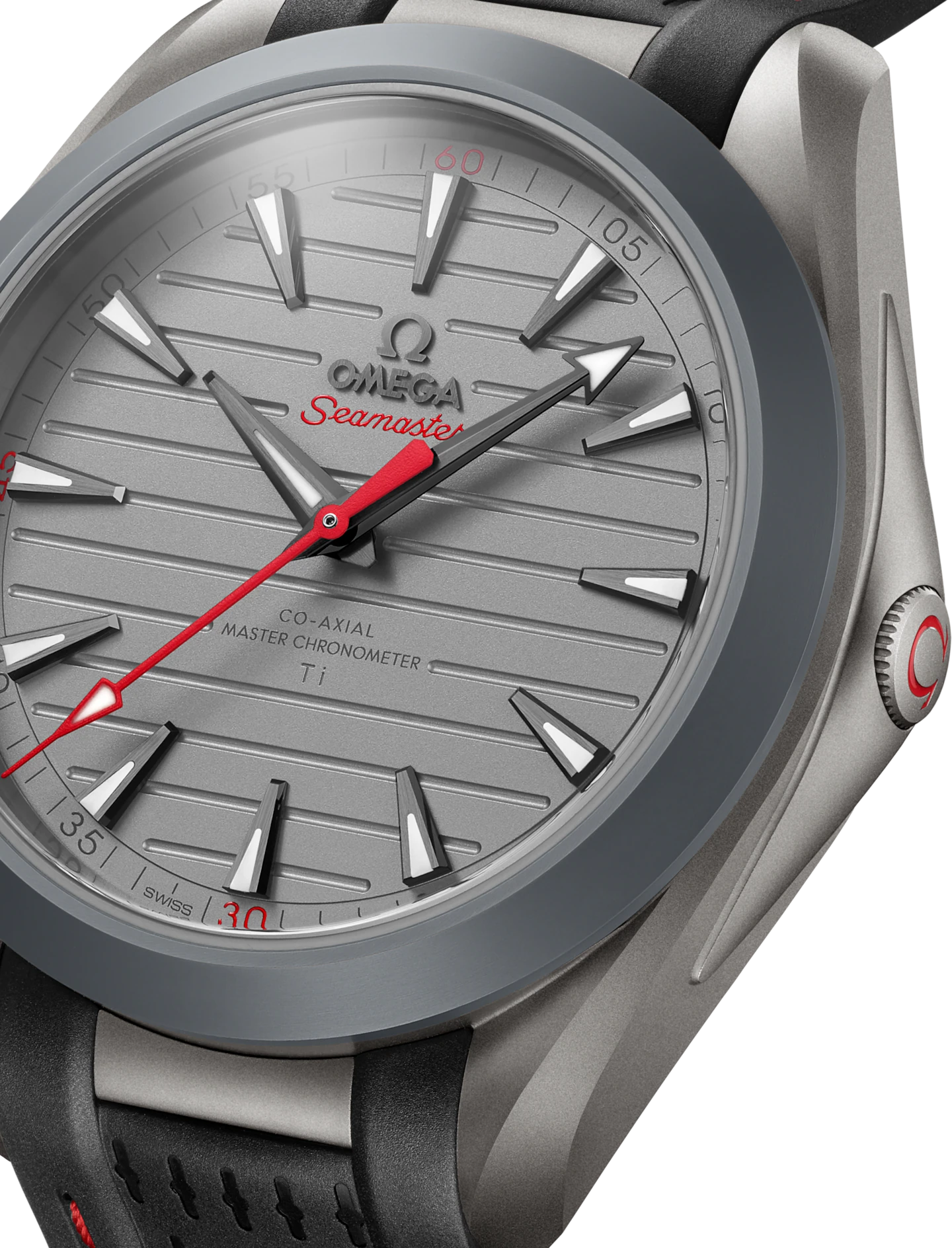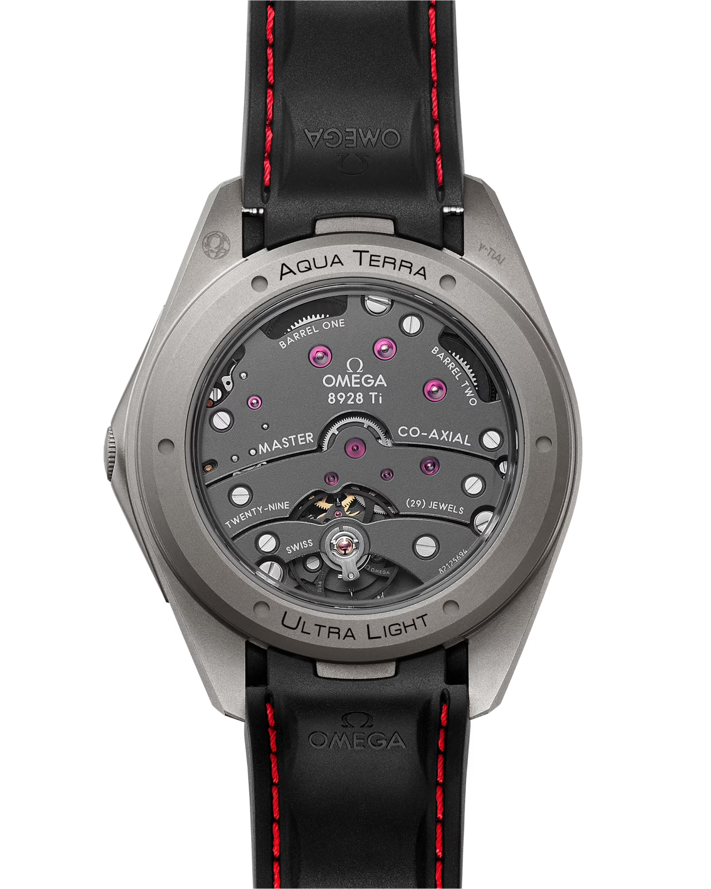 This 41 mm Aqua Terra makes bold use of red on the aluminium seconds hand, Seamaster logo, quarter hour markers and strap stitching. The watch is powered by the OMEGA Co-Axial Master Chronometer Calibre 8928 Ti, the brand's first movement built from titanium.