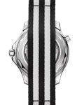 The watch is presented on a black and white striped NATO Strap made of polyester fabric with loops in polished stainless steel, as well as a buckle with the OMEGA logo. Inside, the timepiece is driven by the OMEGA Co-Axial Master Chronometer Calibre 8806, which can be seen through the sapphire-crystal caseback.
