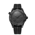 On this 43.50 mm model, black ceramic [ZrO2] dominates. The case, bezel, wave-pattern dial, crown and helium escape valve, all in the same striking material, give the watch a very distinctive, uniform and sculptural look. To ensure visibility without affecting the overall aesthetic, OMEGA has introduced anthracite Super-LumiNova to the diving scale, the black PVD indexes and skeleton hands - and dot at 12H.