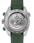 The dial is presented in brushed stainless steel and includes a date window at 6 o’clock, brushed green ceramic subdials, a green varnished number 12, along with transferred words in green and black. The OMEGA logo, hands, and hour markers are all in PVD stainless steel with a brushed finish, while the white Super-LumiNova improves visibility in dark conditions.