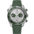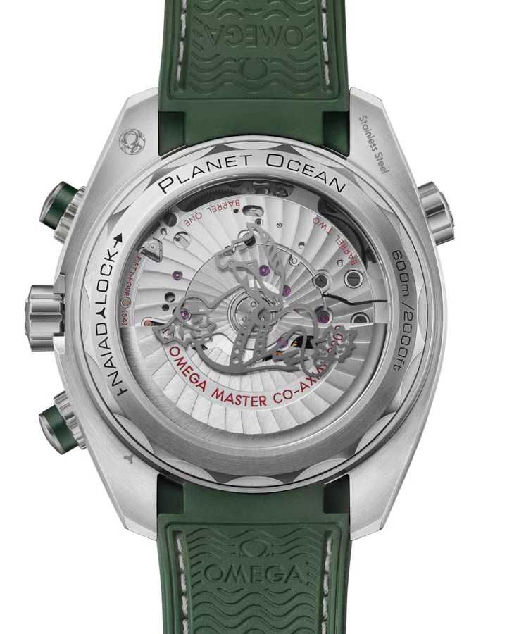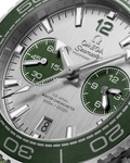 Powered by the Co-Axial Master Chronometer Calibre 9900, this Seamaster Planet Ocean is worn on an integrated green rubber strap with a structured pattern and light grey and green stitching. The NAIAD LOCK caseback is completed with a metallized seahorse on the sapphire crystal.