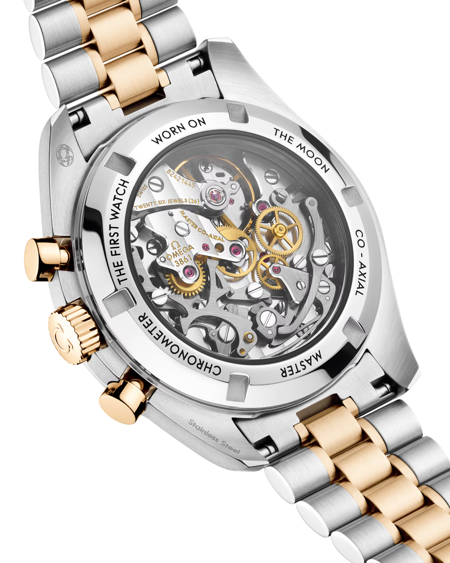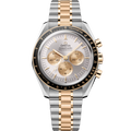 This 42 mm bi-colour model in stainless steel and 18K Moonshine™ Gold features sapphire crystal glass on the front as well as on the caseback. Inspired by the 4th generation Speedmaster style worn on the moon, it includes an asymmetrical case with a black ceramic bezel ring, with its tachymeter scale and famous “dot over ninety” in OMEGA Ceragold™.