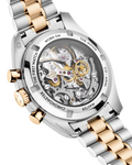 The sun-brushed silvery “step” dial is presented with applied OMEGA logo and indexes, 18K Moonshine™ Gold hands, and galvanic 18K Moonshine™ Gold subdials including a small seconds recorder, 30-minute recorder, and 12-hour recorder.